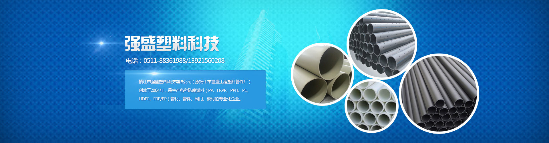 鎮江市強盛塑料科技有限公司(原揚中市昌盛工程塑料管件廠)創建于2004年,是生產各種防腐塑料(PP、FRPP、PPH、PE、HDPE、FRP/PP)管材、管件、閥門、板材的專業化企業。公司擁有各類先進生產設備,固定資產約3800萬元,可生產管材、管件口徑為Φ15-Φ1200mm,產品規格齊全。目前產品廣泛適用于醫藥、食品、冶金、造紙、電力、礦山、城市污水處理、垃圾填埋、輕工紡織等領域,暢銷全國各省市自治區,遠銷二十多個國家及地區。